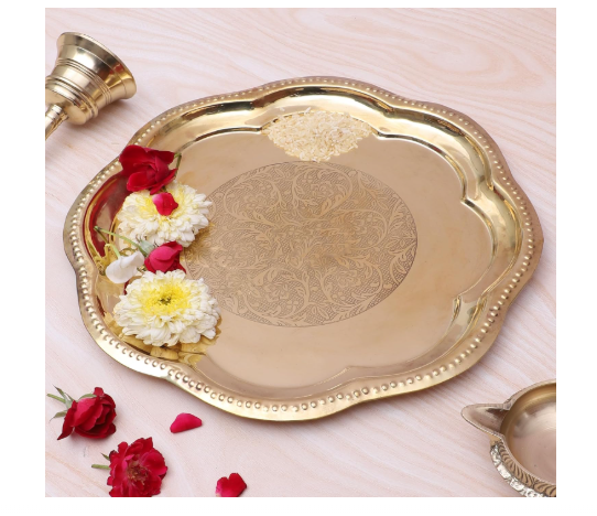 - Timeless Design: The ethnic design of this brass thali for temple use is timeless, ensuring it remains a valued item in your home for generations. Use this brass puja plate to infuse your spiritual practices with tradition and grace, making every pooja and aarti special.