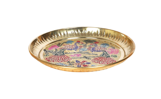 • Enhance Your Pooja Rituals: Use this brass plate for bhog and aarti to elevate your daily worship experience with a touch of luxury and tradition. The beautifully carved twin peacock motif on the plate enhances its spiritual significance, making it an elegant brass pooja plate for your home.