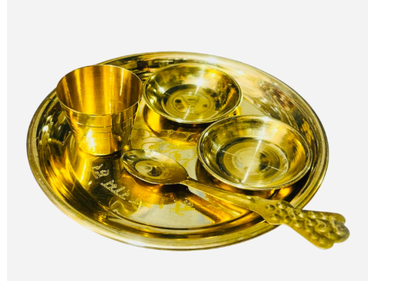 - COMPLETE SET: Includes main thali plate with decorative handle and multiple small brass bowls for various offerings