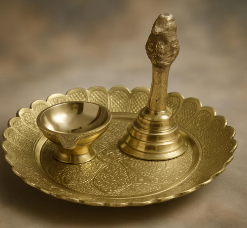Brass Puja Plate (13 cm) with 9 cm Bell & 8.5 cm Diya | Traditional Aarti Plate for Mandir, Diwali, Navratri & Daily Puja Use | Hindu Religious Worship Item