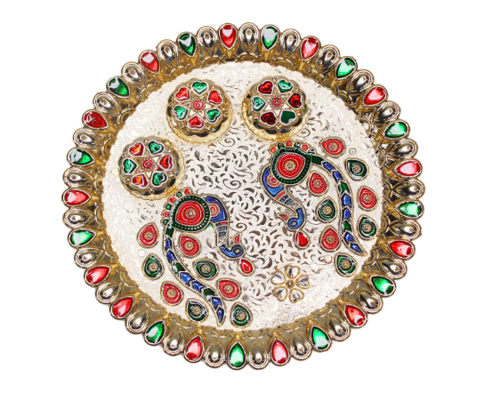 Decoratiove Puja Thali | Rakhi Thali Platter | Peacock Design Pooja Thali for Puja, Festivals, Home Mandir Décore and Gift Item-Set of 1