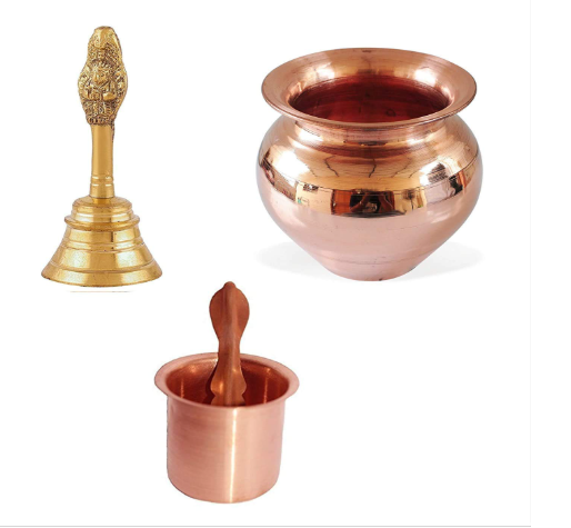 - Combo Of 3, Copper Lota / Kalash / Ghanti / Pancha Patra For Religious Pooja / Best Item For Temple / Home / Office / Gifts For All Pooja Purpose.