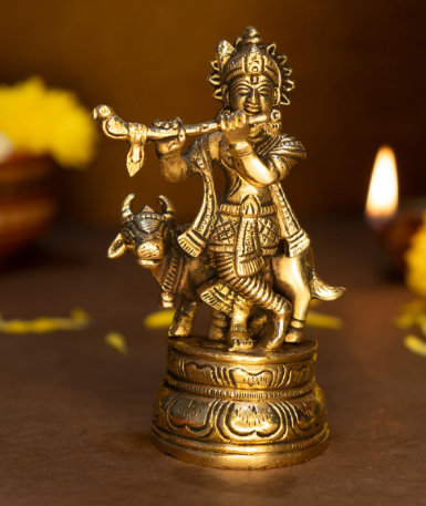 Lord Krishna with Flute and Cow Idol | 11.5 cm Krishna Statue for Pooja Room, Home & Office Decor | Spiritual Decorative Showpiece (Gold Finish)